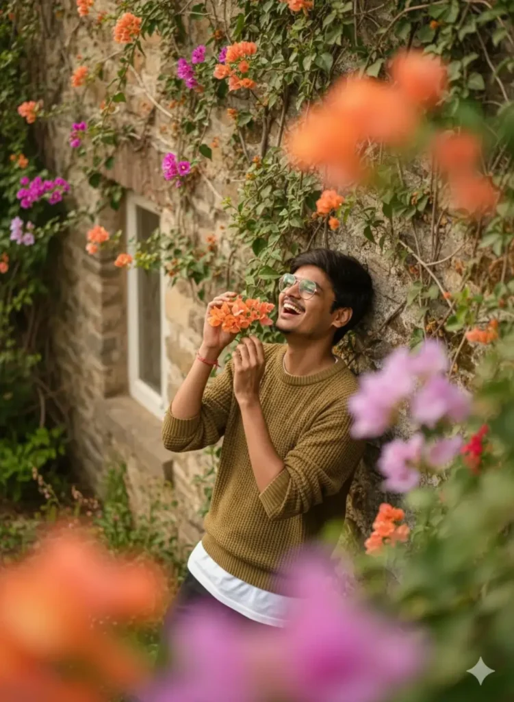 “Create a hyper-realistic overhead 9:16 close-up of myself with glasses, playfully leaning against an ivy-covered stone wall of an old countryside cottage during golden hour. I’m laughing with my head slightly tilted back, one hand brushing away a dangling vine, wearing a textured earth-tone knit sweater layered over a soft white t-shirt. The flowering vines are in full bloom with orange, magenta, and lavender hues, softly blurred in the foreground. Warm, cinematic lighting with a pastel sky glow, ultra-detailed textures, and natural skin tones in sharp focus, captured in 8K.”