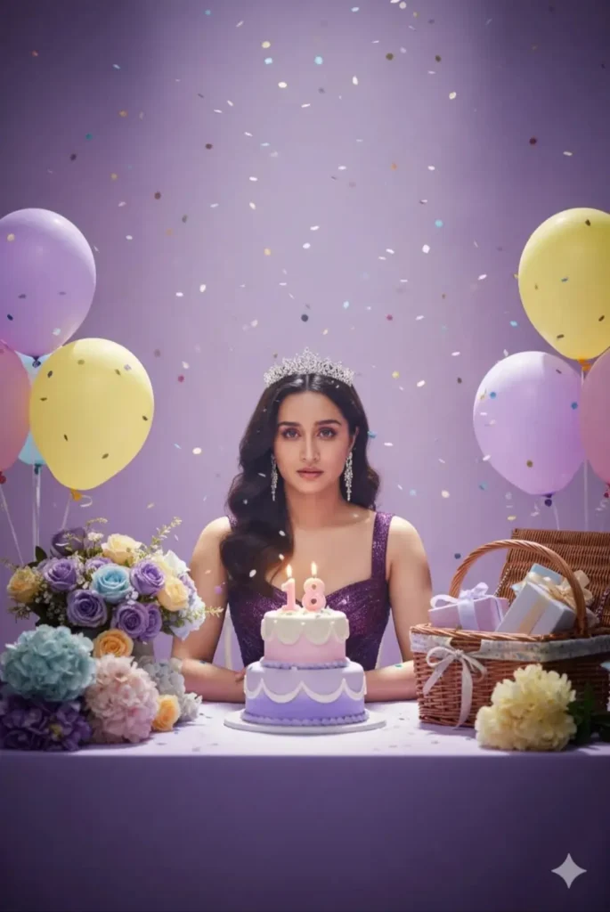 Beautiful young woman (used uploaded photo reference) in a glamorous purple dress, wearing a sparkling tiara, sitting at a decorated party table with a cute layered birthday cake with number 18 candle. Surrounded by balloons, flowers, and a picnic basket, spotlight shining down on her, confetti falling from above, dreamy pastel purple background, cinematic lighting, soft glow, elegant and playful mood, high detail, ultrarealistic, 8K portrait photography.
