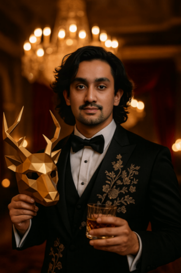 A handsome young man with shoulder-length black wavy hair, fair skin, and a thin mustache, dressed in an elegant black tuxedo with intricate gold embroidery and a black bow tie. He is standing in a luxurious ballroom with grand chandeliers and rich red velvet curtains in the background. He is holding a geometric golden deer mask in one hand and a glass of whiskey in the other, revealing his attractive face with confident expression. The scene is dimly lit with warm, dramatic lighting, capturing a sense of mystery and high-society glamour.